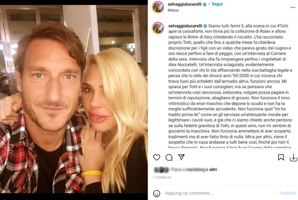La Lucarelli poi affida il suo pensiero in un post su Instagram e sottolinea: “Siamo tutti fermi lì, alla scena in cui Totti apre la cassaforte, non trova più la collezione di Rolex e allora rapisce le Birkin di Ilary chiedendo il riscatto. L’ha raccontato proprio Totti, quello che fino a qualche mese fa chiedeva discrezione per i figli con un video che pareva girato dal cugino e ora riesce perfino a fare di peggio, con un’intervista al Corriere della Sera. Intervista che fa rimpiangere perfino i virgolettati di Alex Nuccetelli. Un’intervista sciagurata, evidentemente concordata con chi lo sta affiancando nella sua battaglia legale e pensa che lo stile dei divorzi anni ‘90-2000 in cui vinceva chi tirava fuori più scheletri dall’armadio altrui, funzioni ancora”.