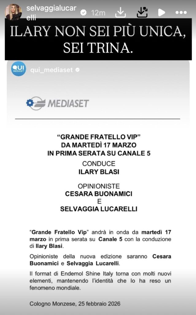 L’annuncio è arrivato nel pomeriggio di mercoledì 25 febbraio attraverso i canali ufficiali di Mediaset e la news è stata poi ribattuta dalla diretta interessata, che ha anche commentato con una battuta su Ilary Blasi.
