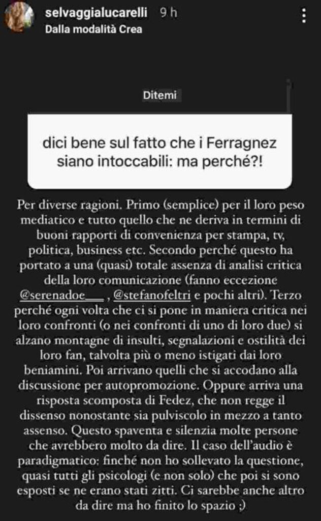 La Lucarelli ritiene che i Ferragnez siano ‘intoccabili' “per diverse ragioni". “Primo (semplice) per il loro peso mediatico e tutto quello che ne deriva in termini di buoni rapporti di convenienza per la stampa, tv, politica, business, etc. - scrive Selvaggia - Secondo perché questo ha portato a una (quasi) totale assenza di analisi critica della loro comunicazione. Terzo perché ogni volta che ci si pone in maniera critica nel loro confronti (o nei confronti di uno di loro due) si alzano montagne di insulti, segnalazioni e ostilità dei loro fa, talvolta più o meno istigati dai loro beniamini”.