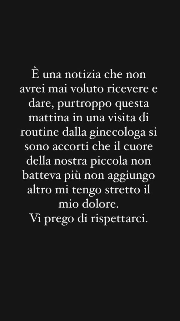 “E’ una notizia che non avrei mai voluto ricevere e dare, purtroppo questa mattina in una visita di routine dalla ginecologa si sono accorti che il cuore della nostra piccola non batteva più non aggiungo altro mi tengo stretto il mio dolore. Vi prego di rispettarci”, scrive la Roma, che invita tutti a rispettare la privacy e il dolore che lei e Luca provano in questo momento.
