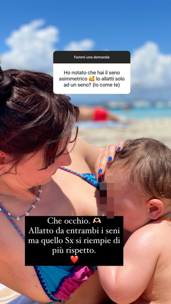 Una follower le scrive che ha notato il suo seno asimmetrico e le domanda se allatti solo a una mammella o meno. “Che occhio! Allatto a entrambi i seni, ma quello sinistro di riempie di più rispetto all’altro”, rivela la Pauselli. E’ molto gioiosa. “Mi rende felice la fatica che abbiamo fatto per avere tutto quello che abbiamo”, sottolinea.