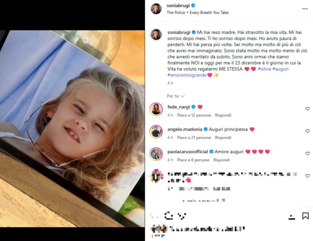 ''Mi hai reso madre. Hai stravolto la mia vita. Mi hai sorriso dopo mesi. Ti ho sorriso dopo mesi. Ho avuto paura di perderti. Mi hai persa più volte. Sei molto ma molto di più di ciò che avrei mai immaginato. Sono stata molto ma molto meno di ciò che avresti meritato da subito. Sono anni ormai che siamo finalmente NOI e oggi per me il 23 dicembre è il giorno in cui la Vita ha voluto regalarmi ME STESSA''.