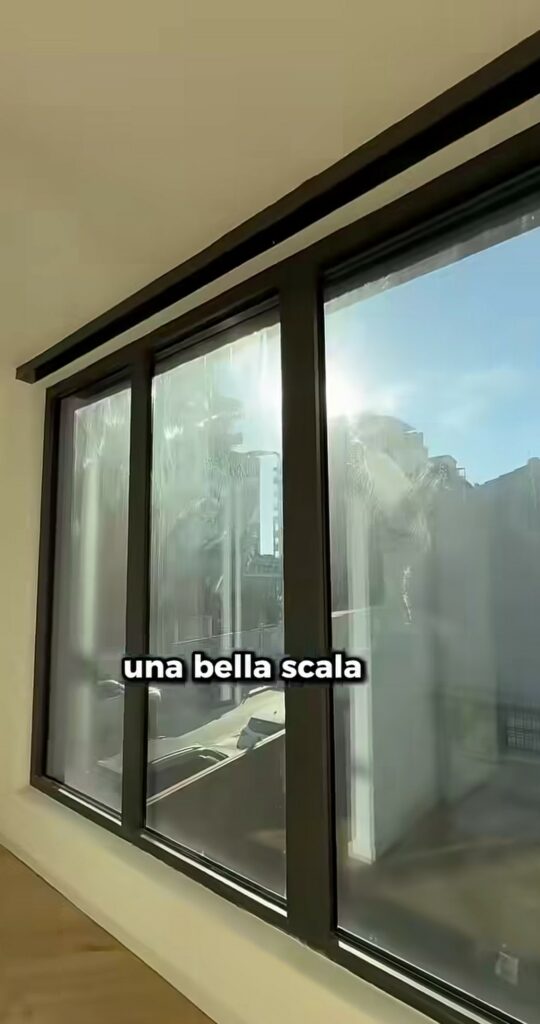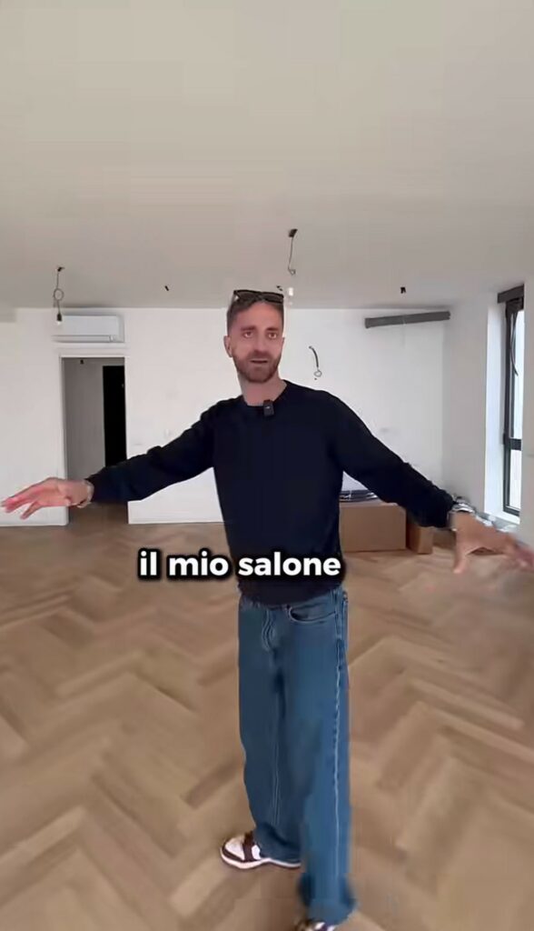 Stefano arriva davanti a un immobile con grande vetrate: “Questa è la casa. Vuoi vedere dentro? Eccoci qua, questo sarà il mio salone con cucina a vista, area divani, una bella tv e camino al bioetanolo. Poi c’è un disimpegno, il primo bagno cieco, la camera da letto. Non si sente niente perché è tutto insonorizzato. Doppi vetri, cappotto: abbiamo fatto un lavoro incredibile!”. L’abitazione è enorme e già in parte ristrutturata.