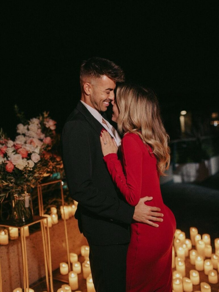 L’attaccante, nelle fila anche della Nazionale, sorprende la Pagani. La porta a cena nella Capitale su una terrazza romantica, allestita con una infinità di candele e fiori. Lei quando lo vede inginocchiarsi e aprire la custodia contenente il preziosissimo gioiello, si accovaccia a sua volta. Indossa un abito aderente a maniche lunghe rosso e ai piedi scarpe con tacchi vertiginosi dorate. Si copre il volto con le mani e scoppia a piangere.