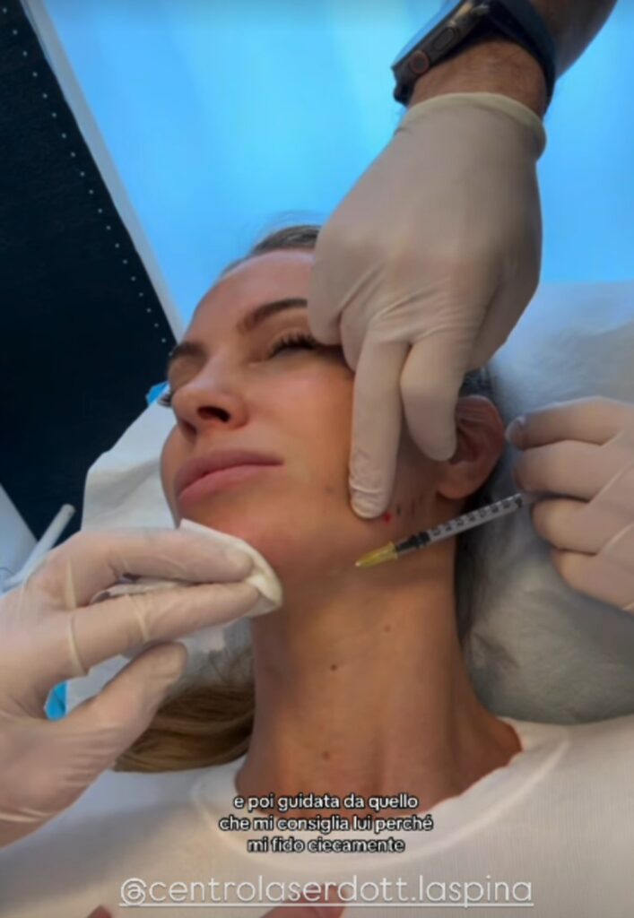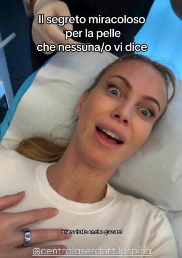 “Mi chiedono il segreto per la mia pelle bellissima, eccolo qui il segreto, il segreto di Pulcinella”, dice la 32enne. “Ovviamente abbiamo fatto il Botox”, aggiunge. Parte la sua voce fuori campo: “Vi porto con me a fare il trattamento più funzionale in assoluto, ovvero il Botox, quello che fanno quasi tutte, ma che in pochissime hanno il coraggio di raccontarvi. Io vado dal dottor La Spina ormai da 12 anni. Avevo esattamente 20 anni quando ho cominciato a fare il Botox e ormai mi fido solo di lui”.