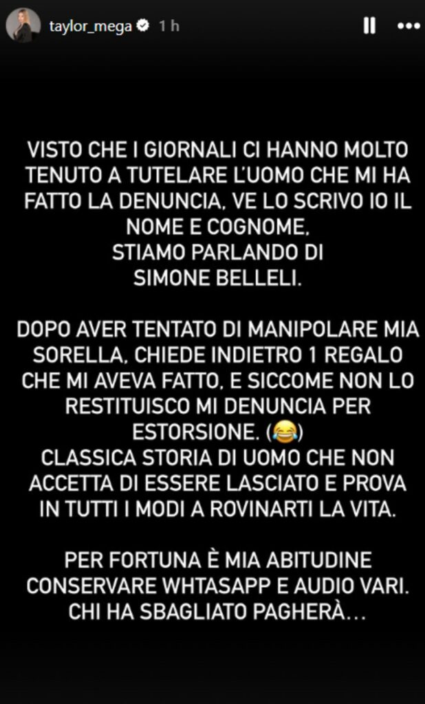 L’influencer esce allo scoperto e in un post spiega rivela il nome dell’uomo che l’ha denunciata e chiarisce: “Dopo aver tentato di manipolare mia sorella, chiede indietro un regalo che mi aveva fatto, siccome non lo restituisco, mi denuncia per estorsione. Classica storia di un uomo che non accetta di essere lasciato e prova in tutti i modi a rovinarti la vita. Per fortuna è mia abitudine conservare Whatsapp e audio vari. Chi ha sbagliato pagherà…”.