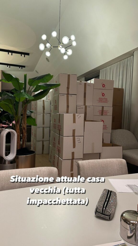 La fashion blogger 36enne nelle sue IG Stories fa vedere gli scatoloni impilati che contengono tutto quello che va portato nella nuova abitazione. "Situazione casa attuale, tutta impacchettata”, sottolinea. Quella appena passata è stata l’ultima domenica nel vecchio appartamento.
