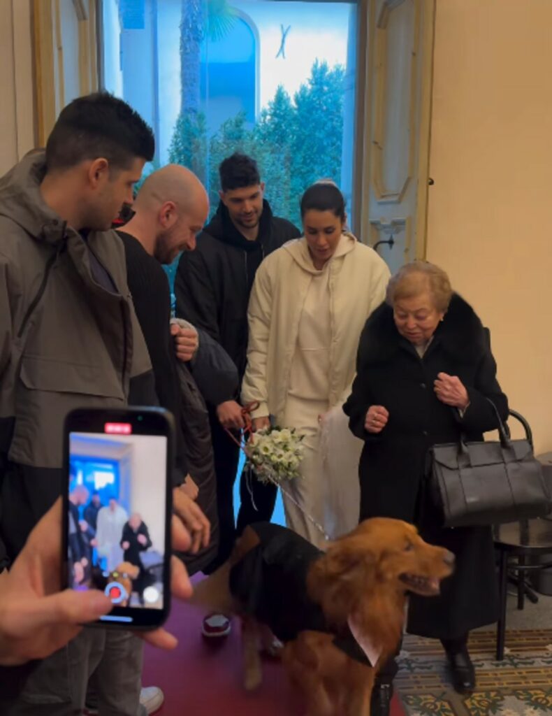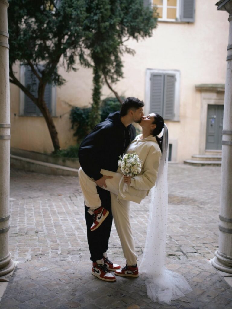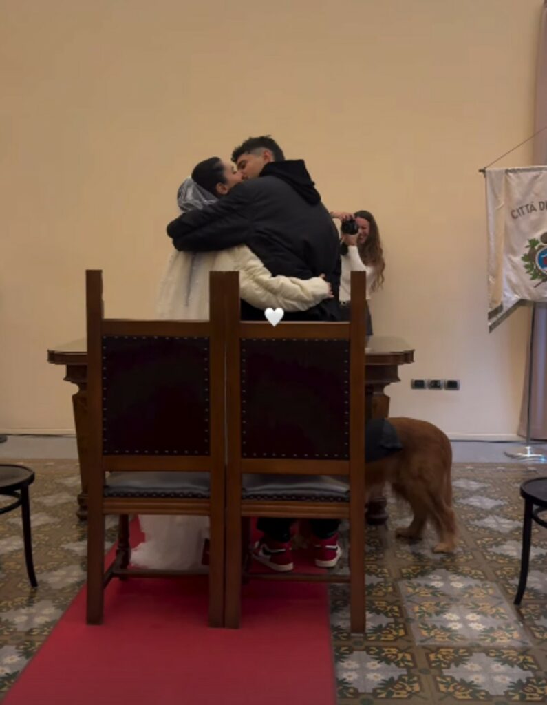 Tra i testimoni anche il cane della coppia, il golden retriever Muffin. L'amore tra i due è nato proprio sui campi di basket, da sempre passione di entrambi. Per il grande giorno con comune sono arrivati entrambi con look sportivo: tuta bianca con velo in testa per la 34enne e nera per il 32enne, entrambi con le iconiche Air Jordan ai piedi.