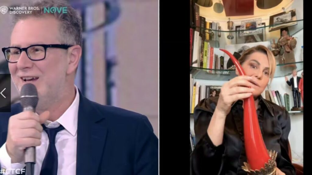 - La sera, però, non è assente a CTCF, da Fazio su Nove si collega da casa e mostra il corno portafortuna