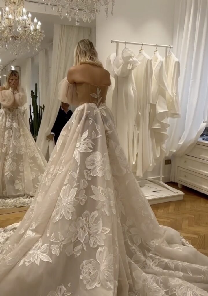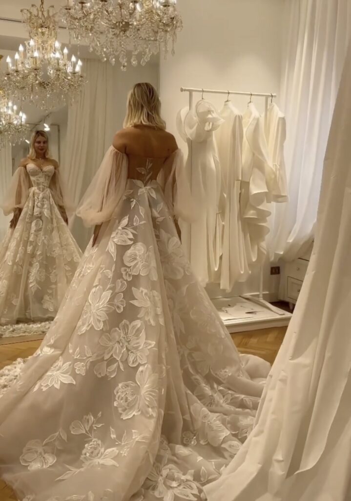 In una clip postata su Instagram appare mentre si osserva con un classicissimo abito da sposa. Sembra una principessa. Non trattiene la commozione vedendo il riflesso allo specchio.