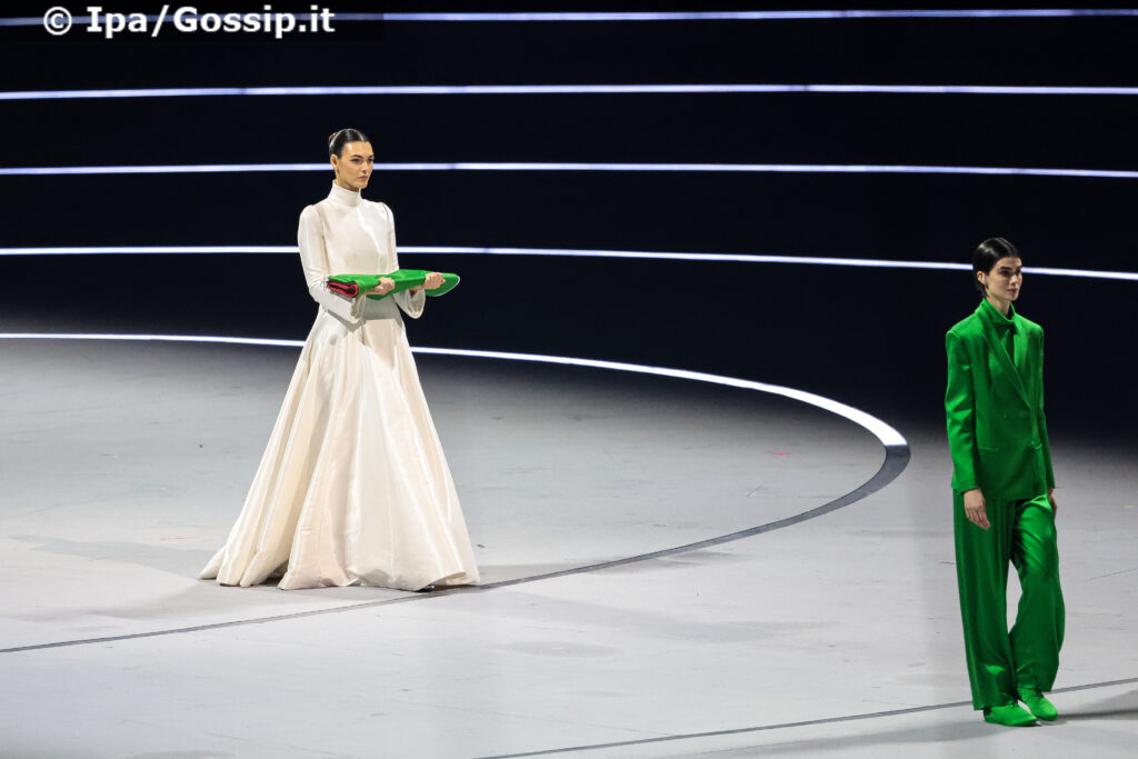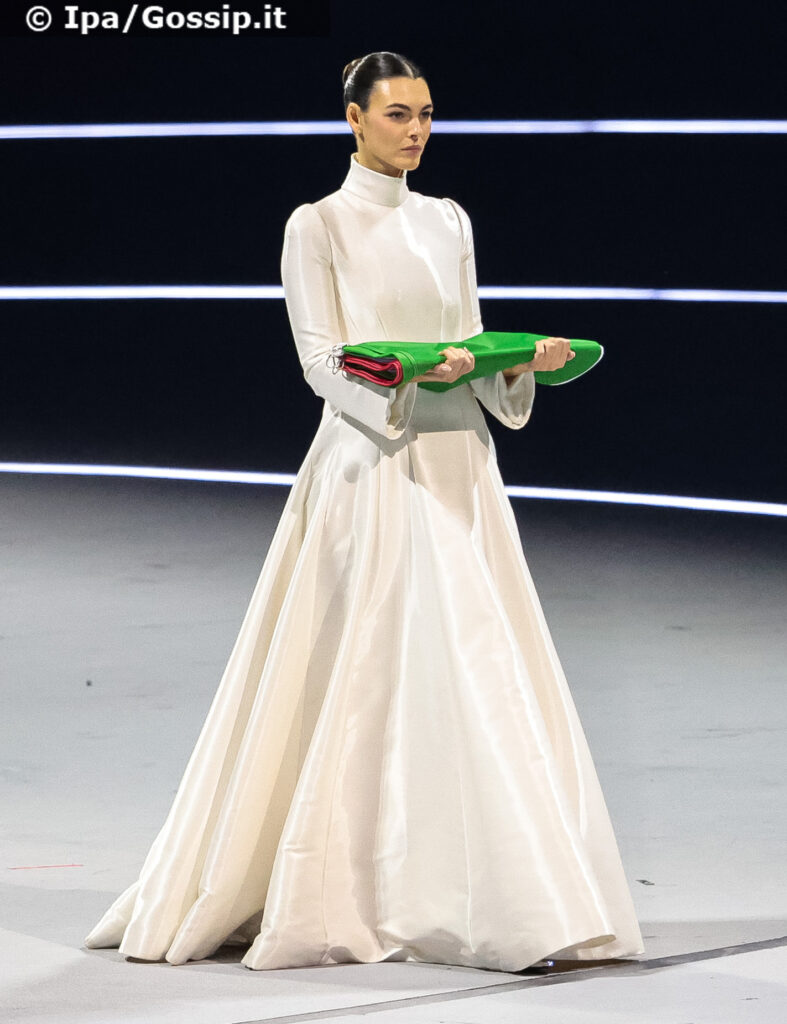 Per l’occasione la modella ha indossato un abito lungo bianco su misura, firmato Armani Privé. Il vestito, con maniche lunghe scenografiche e collo alto, ha attirato l’attenzione del pubblico, soprattutto per l’eleganza con cui Ceretti ha accompagnato il momento solenne della consegna della bandiera.