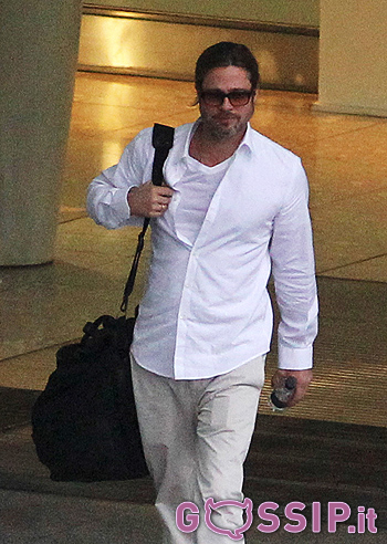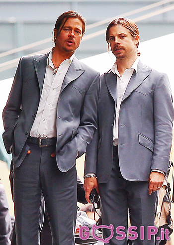 Abito grigio, pizzetto e codino biondo per l’attore Brad Pitt, sul set londinese del nuovo film che…