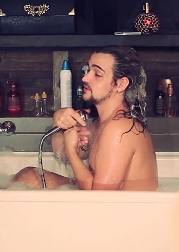Nudo nella vasca da bagno, in compagnia di uno dei suoi amatissimi chihuahua. Valerio Scanu,…